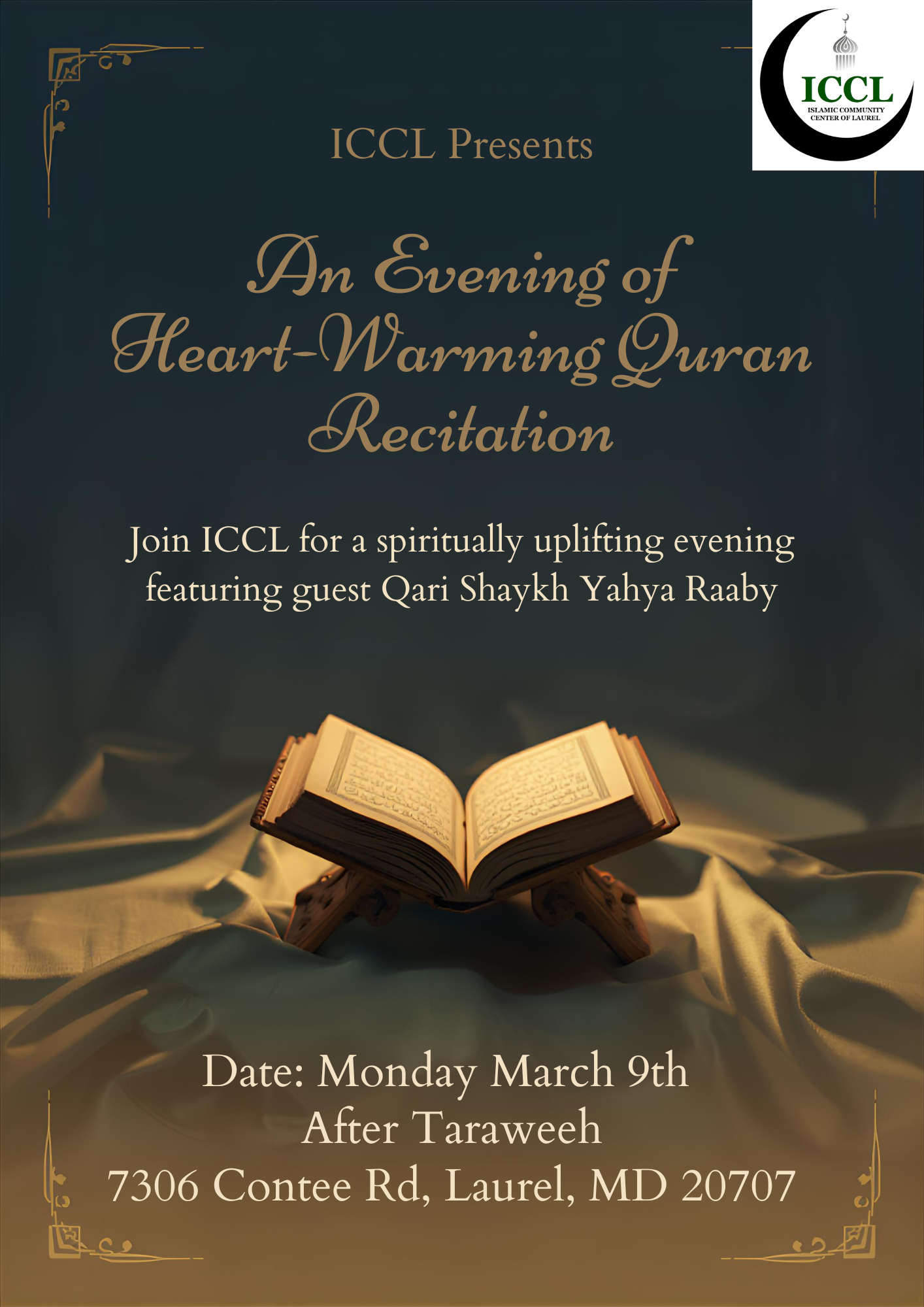 Join ICCL for a spiritually uplifting evening featuring guest Qari Shaykh Yahya Raaby